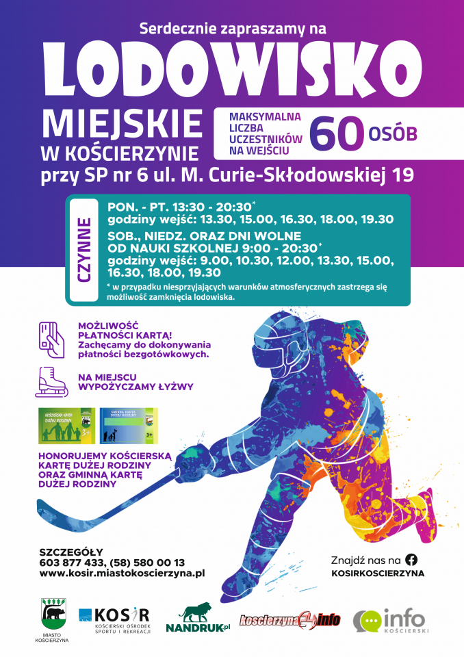W związku z luzowaniem obostrzeń serdecznie zapraszamy na Lodowisko Miejskie przy SP nr 6 w Kościerzynie, ul. Marii Curie-Skłodowskiej 19. Ponowne otwarcie nastąpi 12 lutego 2021 r. o godz. 13.30.